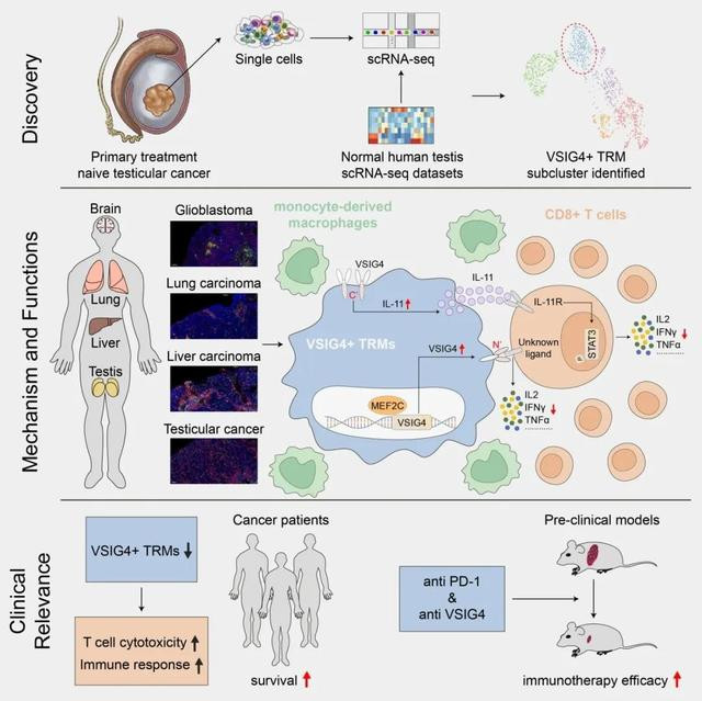 研究团队通过单细胞测序和谱系追踪技术,在人睾丸癌组织和小鼠的多个正常组织中,发现了一类TRMs起源的VSIG4+巨噬细胞亚群,并在肝癌、肺癌等多种实体瘤中验证其广泛存在。临床队列分析显示,VSIG4+ TAMs的高比例与睾丸癌和肝癌患者较短的生存时间和肿瘤晚期、血管侵犯等不良预后因素显著相关。
