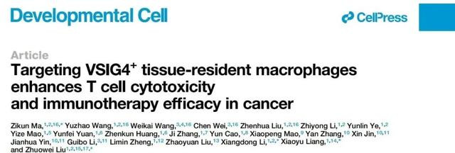 编者按:2025年5月7日,中山大学肿瘤防治中心泌尿外科刘卓炜团队在Developmental Cell上发表题为:“靶向VSIG4+组织驻留巨噬细胞增强T细胞毒性和免疫治疗疗效”的文章。研究团队通过整合患者样本分析、多组学技术解析以及临床前模型验证的多维度研究策略,系统阐明TRMs在肿瘤微环境中的功能特征及其调控网络,将为开发更具针对性的联合治疗方案提供重要理论依据。